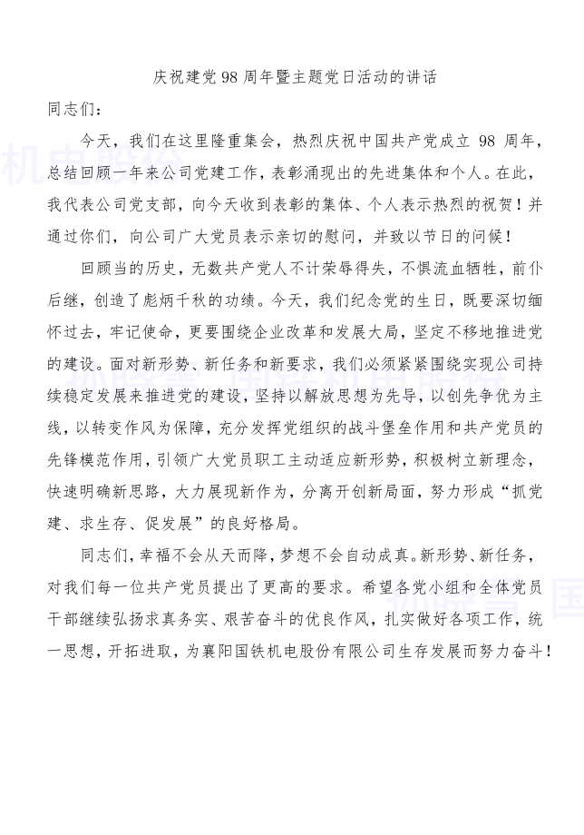 今年是建黨98周年?!捌咭弧鼻昂?,襄陽(yáng)國(guó)鐵機(jī)電股份有限公司開展了豐富多彩的紀(jì)念活動(dòng),以傳承紅色基因、弘揚(yáng)革命精神,不忘初心、牢記使命,矢志為中華民族偉大復(fù)興中國(guó)夢(mèng)努力奮斗。